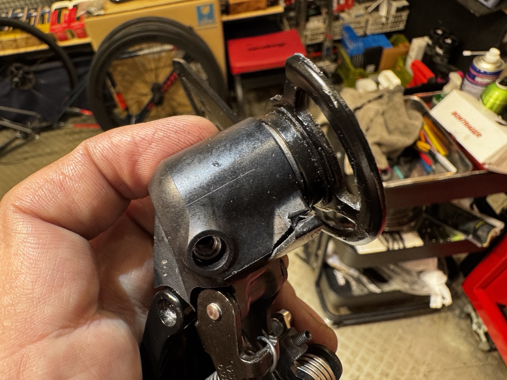 で、発見してしまった破損。壊れていたか、壊れそうだったところにバラした際引導を渡してしまったかわかりませんが、いずれにしてもこれで走行していたら大変なことになっていたと思うので気がついてよかったです。