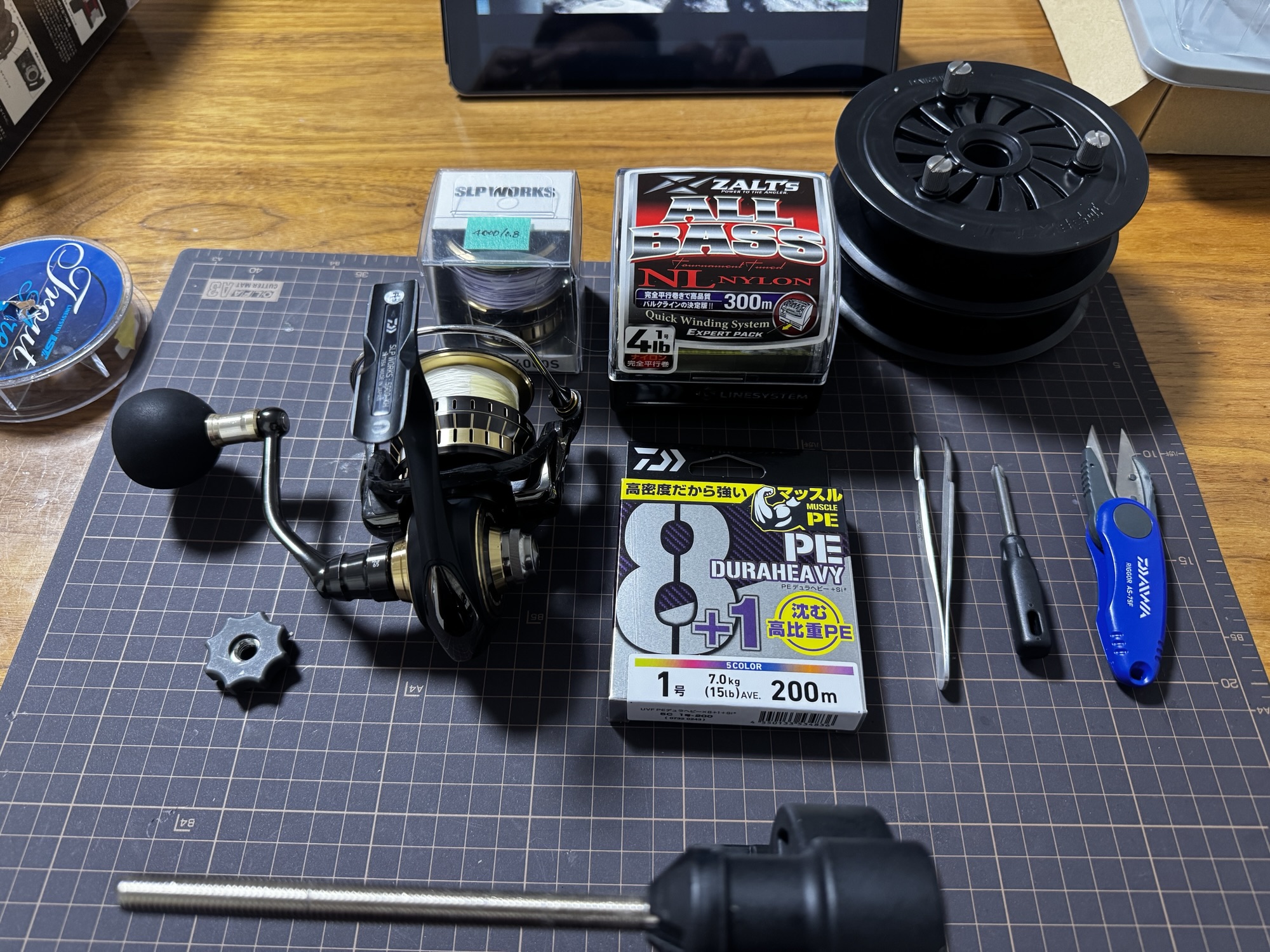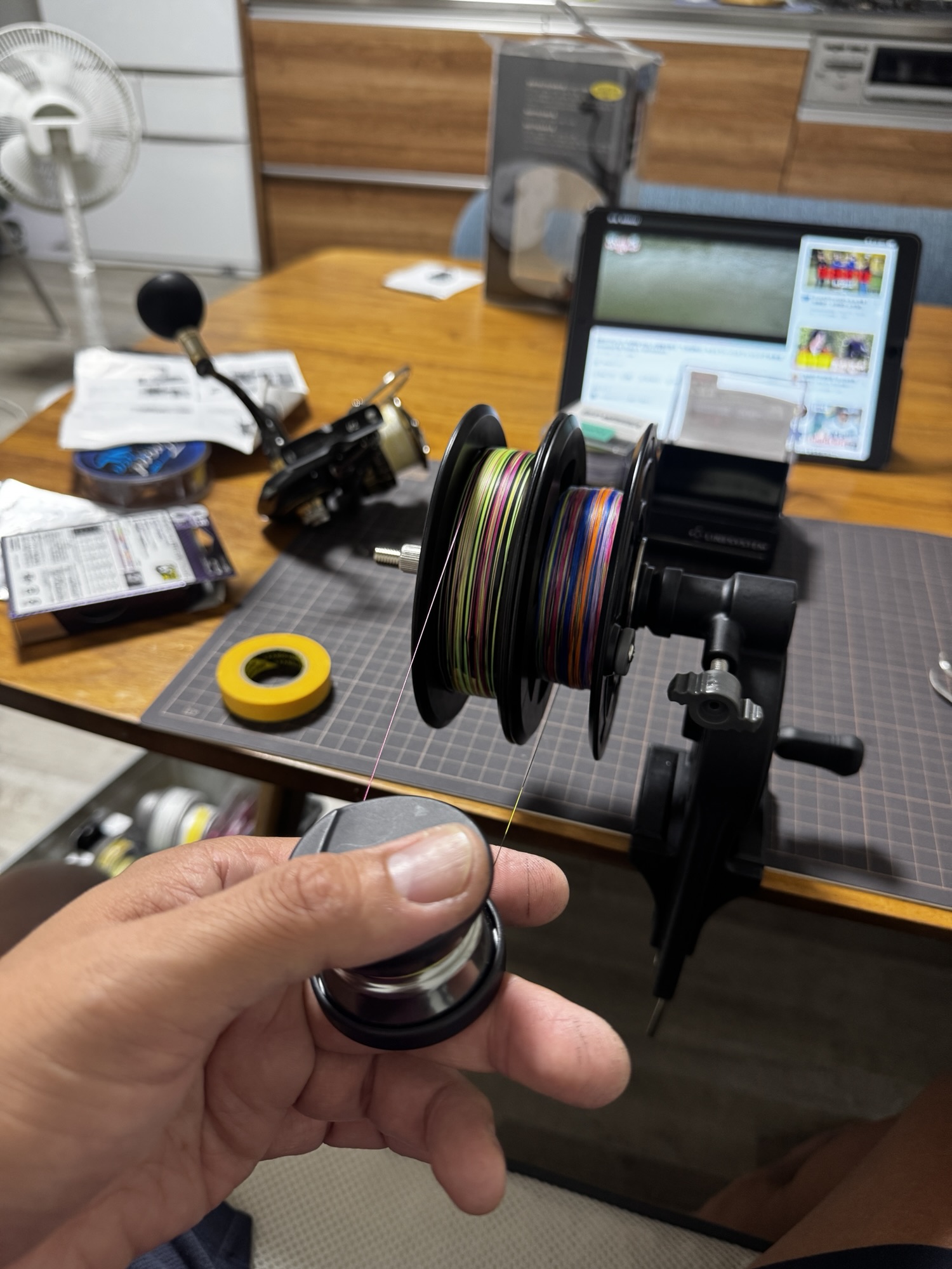 下巻き入れる、一旦戻す、逆まきする、リールに巻く。一回ラインをリールにセットするのにこんなにも工程がかかってます(釣具具屋?)