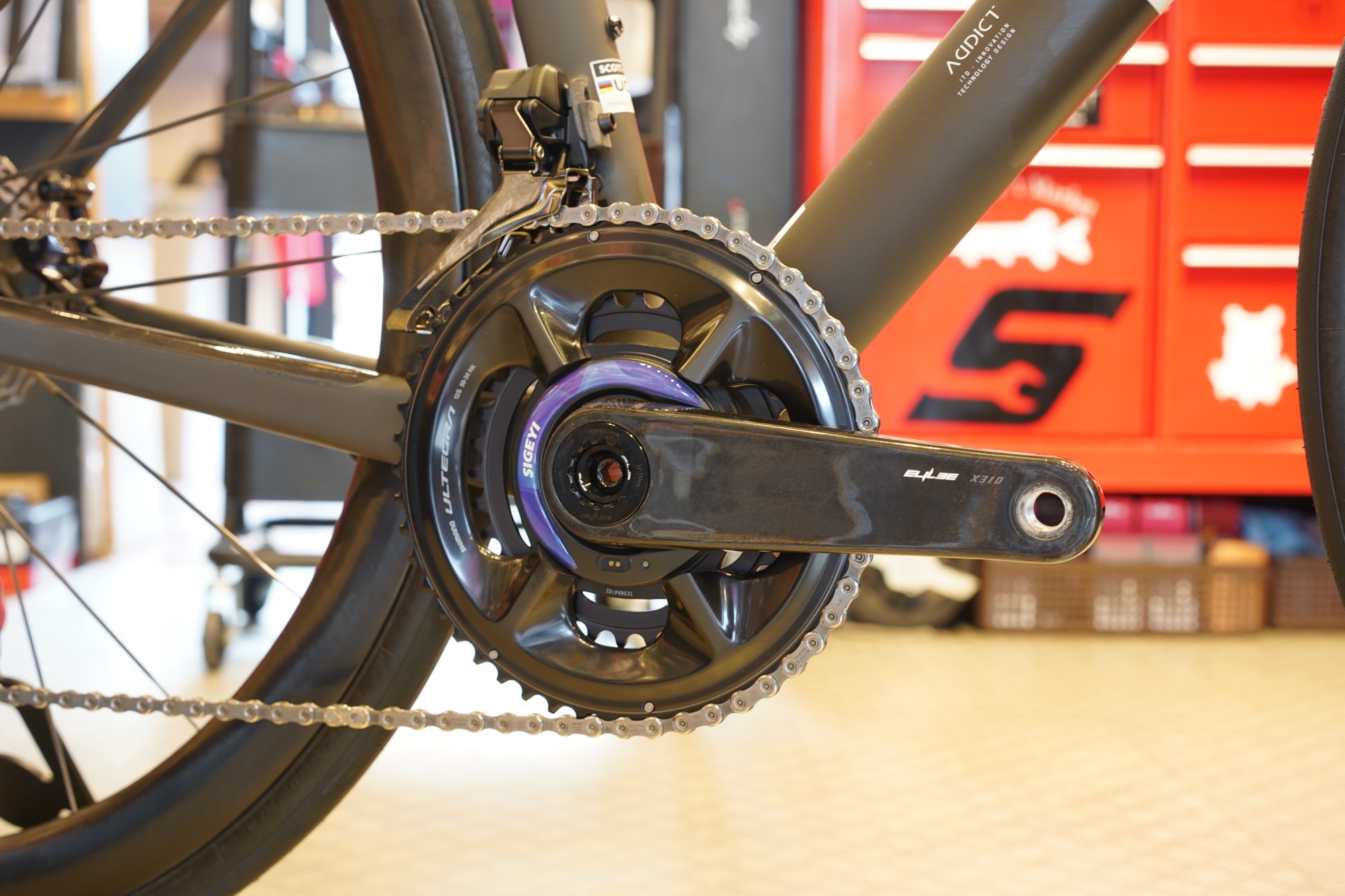 クランクは最近引き合いが多いエライリークランクにSIGEYIのパワーメーターにシマノのリングの組み合わせ。