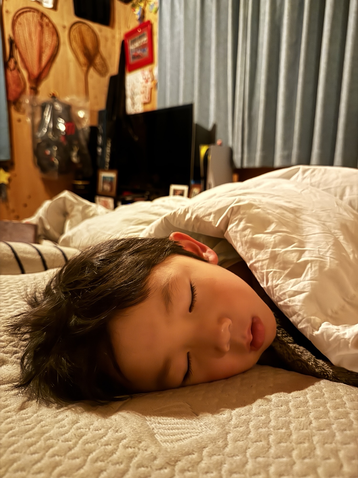別宅で牛丼食べさせ、腹もくちたのか「眠い。。。」とベッドに横になり始めたので、頑張って起こして歯を磨き、パジャマに着替えさせて、夢の世界へ旅経たせました。