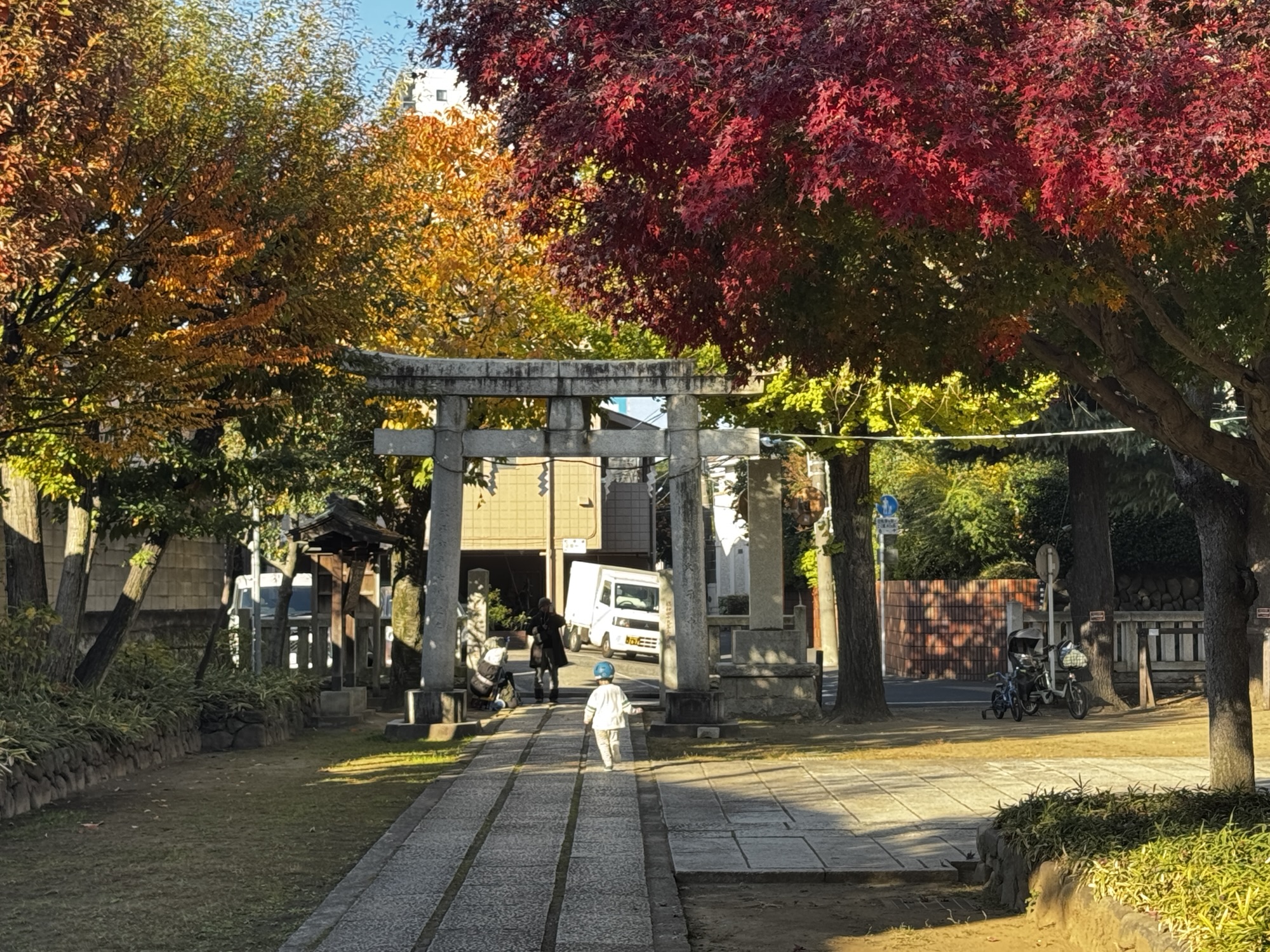 保育園の時のように徒歩で(今日は自転車だったけど)、近所のおばあちゃんの家に挨拶に行ってお菓子貰って、次は公園で少し遊んで、最後は神社に行ってお参りしてから、かけっこで先生の所まで競争って言って幼稚園に行くんです。