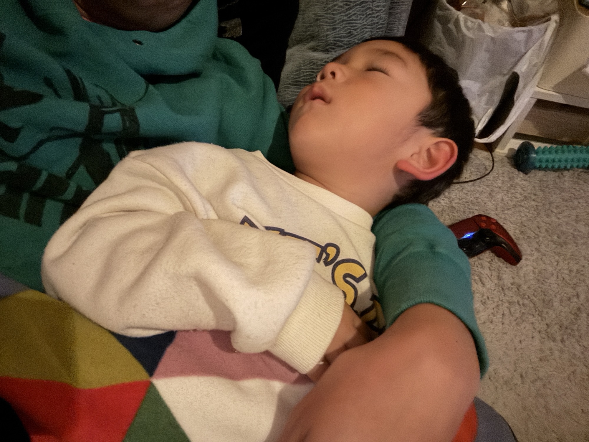 お迎え後、ソファーで二人でゴロゴロカーズの映画を見ていたら、いつの間にか腕の中で眠っておりました。