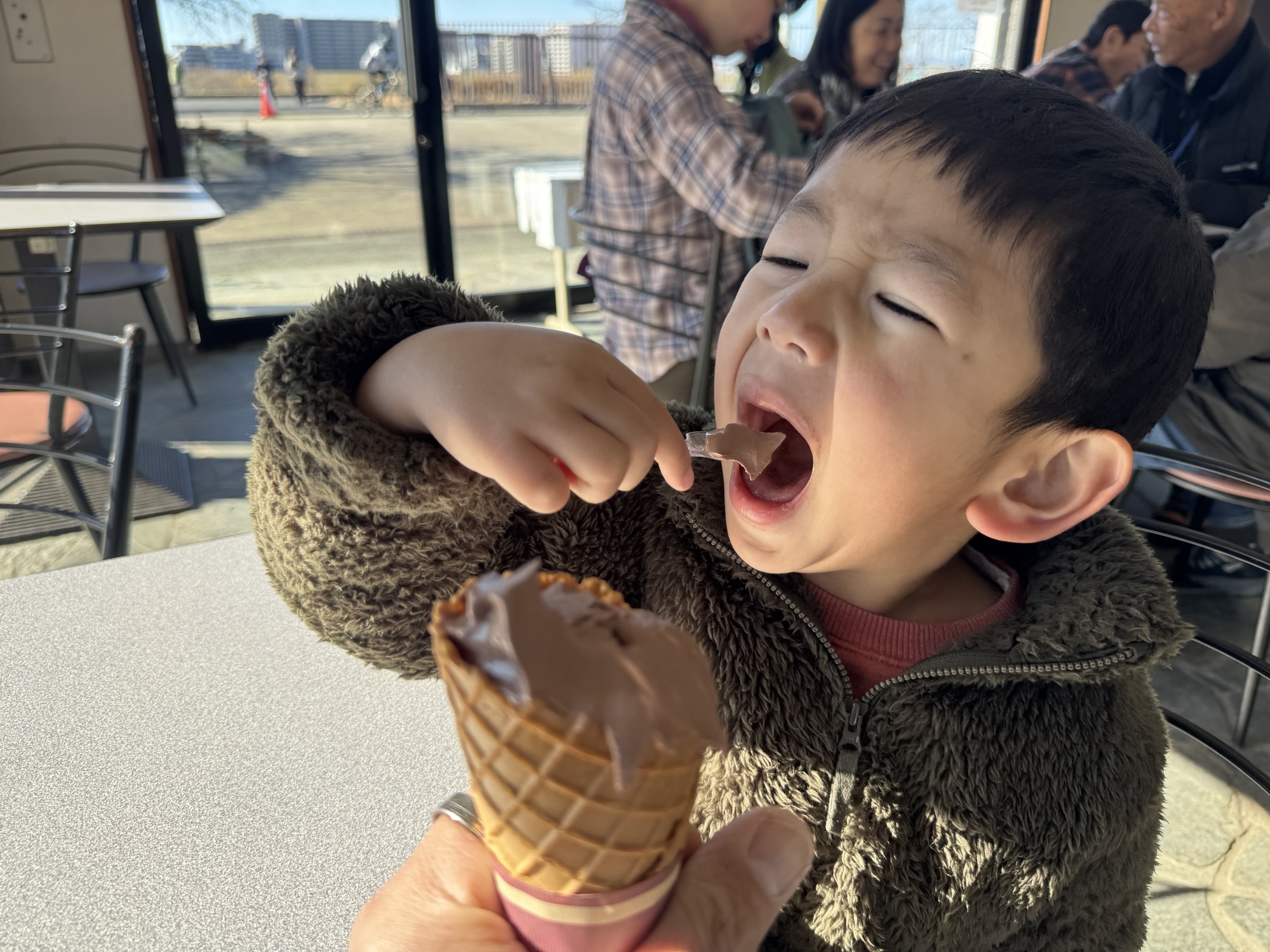 とりあえず「ソフトクリーム食べる?」と聞いたら食べると言うので、キッチンとれたてで美味しいチョコレートソフトクリームを頂きました。