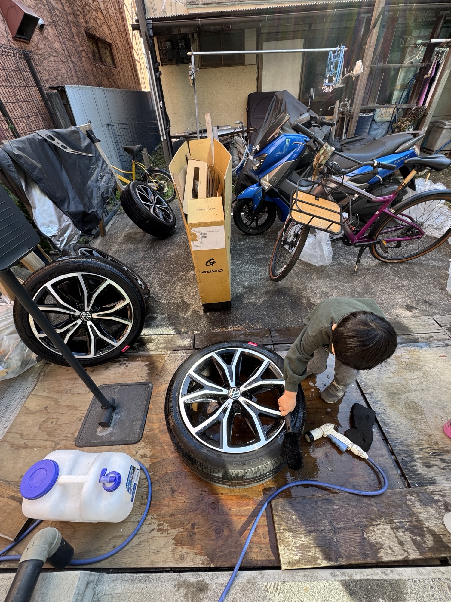 うちのメカニックにノーマルタイヤホイール洗ってもらいました。