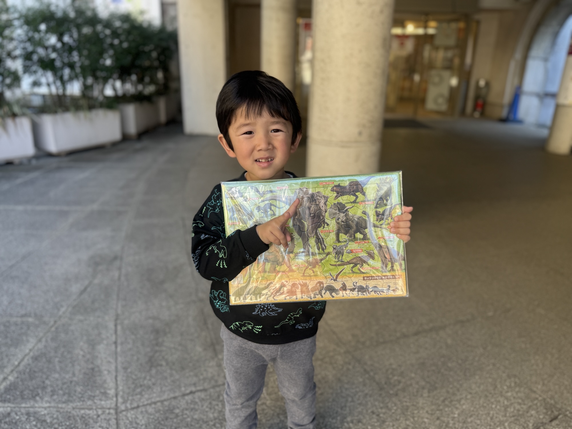 パズルとティラノサウルスのフィギュアを買ってもらいご満悦の氏。帰りの車は爆睡。