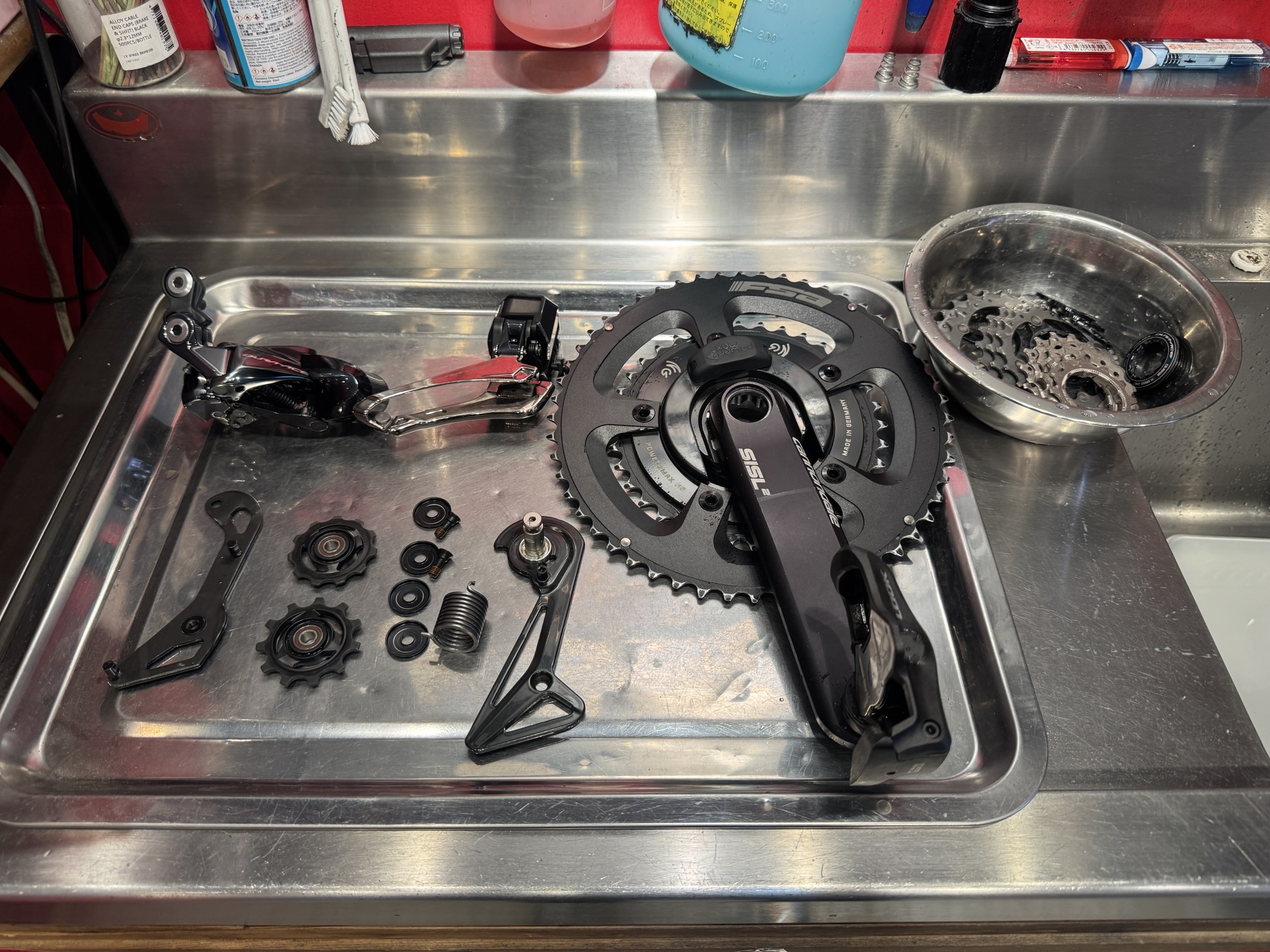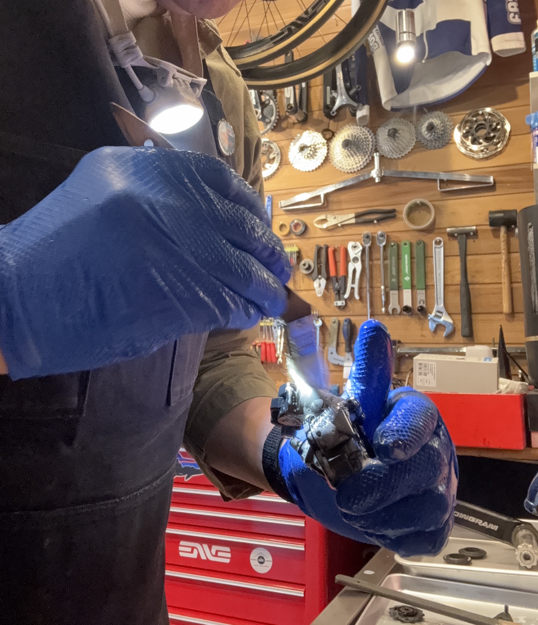 溶剤で汚れを落とした後、洗剤で洗っている図。ヘッドライトが目の老化を感じます(ただ光量が足りないだけ)