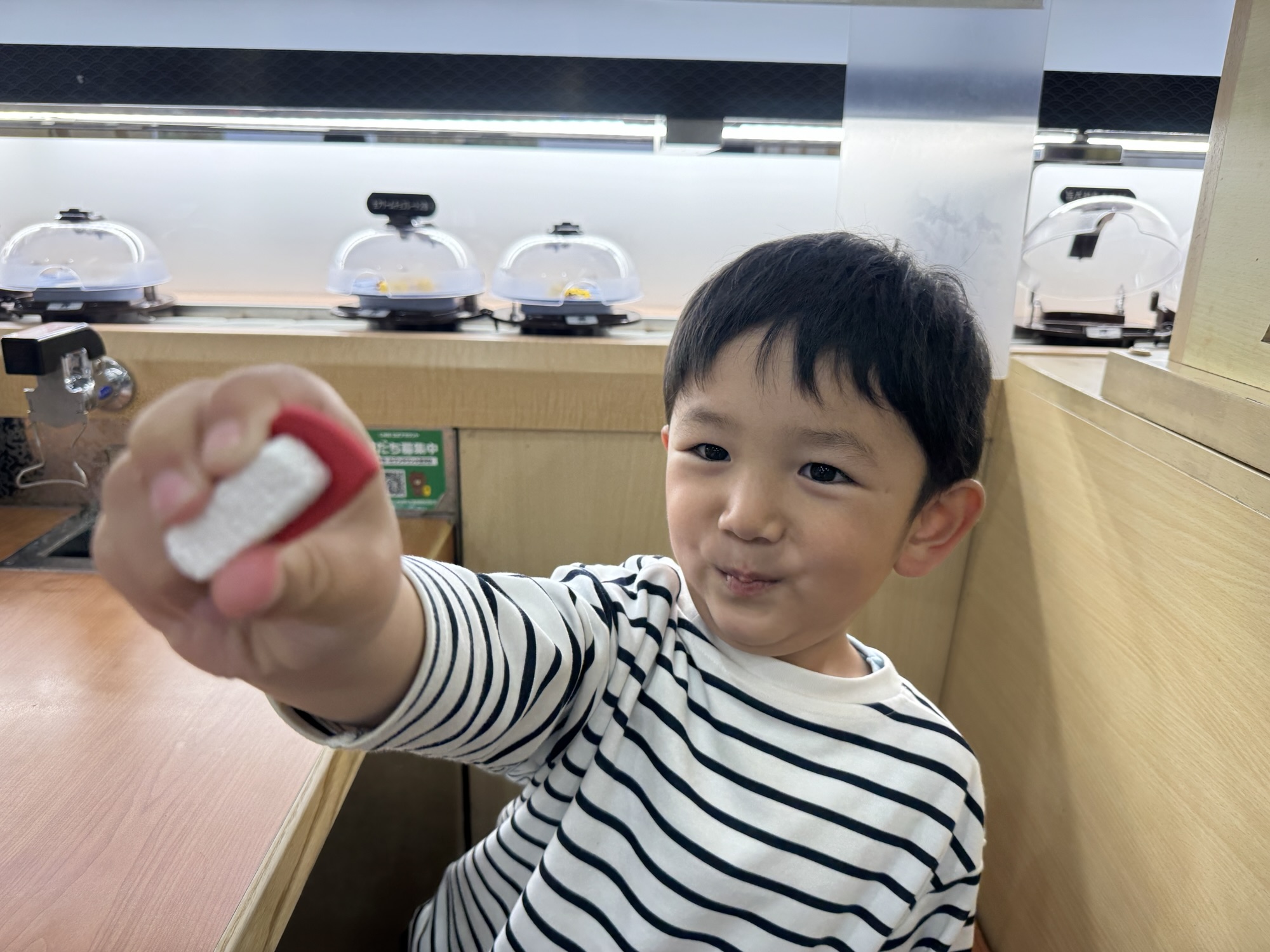 帰宅して釣具の片付けをして、義母に預けていた息子二人を回収後、仕事中の妻は抜きで、次の日の水曜日に高校の入学式を迎える長男のお祝いで3人で回る寿司に来ました。