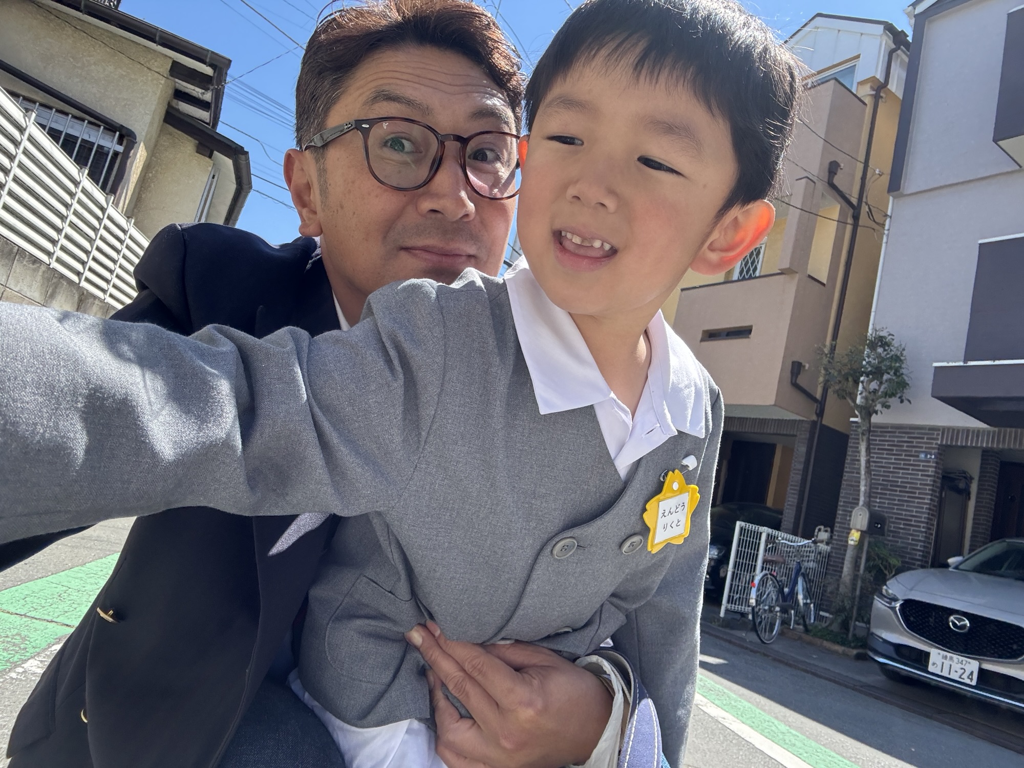 今日は晴れて進級式。普段着でOKです言われていたけど、同時に入園式もやりますから晴れの気分のご家庭の保護者の方々の気分を害さないよう、私もジャケットに身を包み二人で仲良く登園ですw