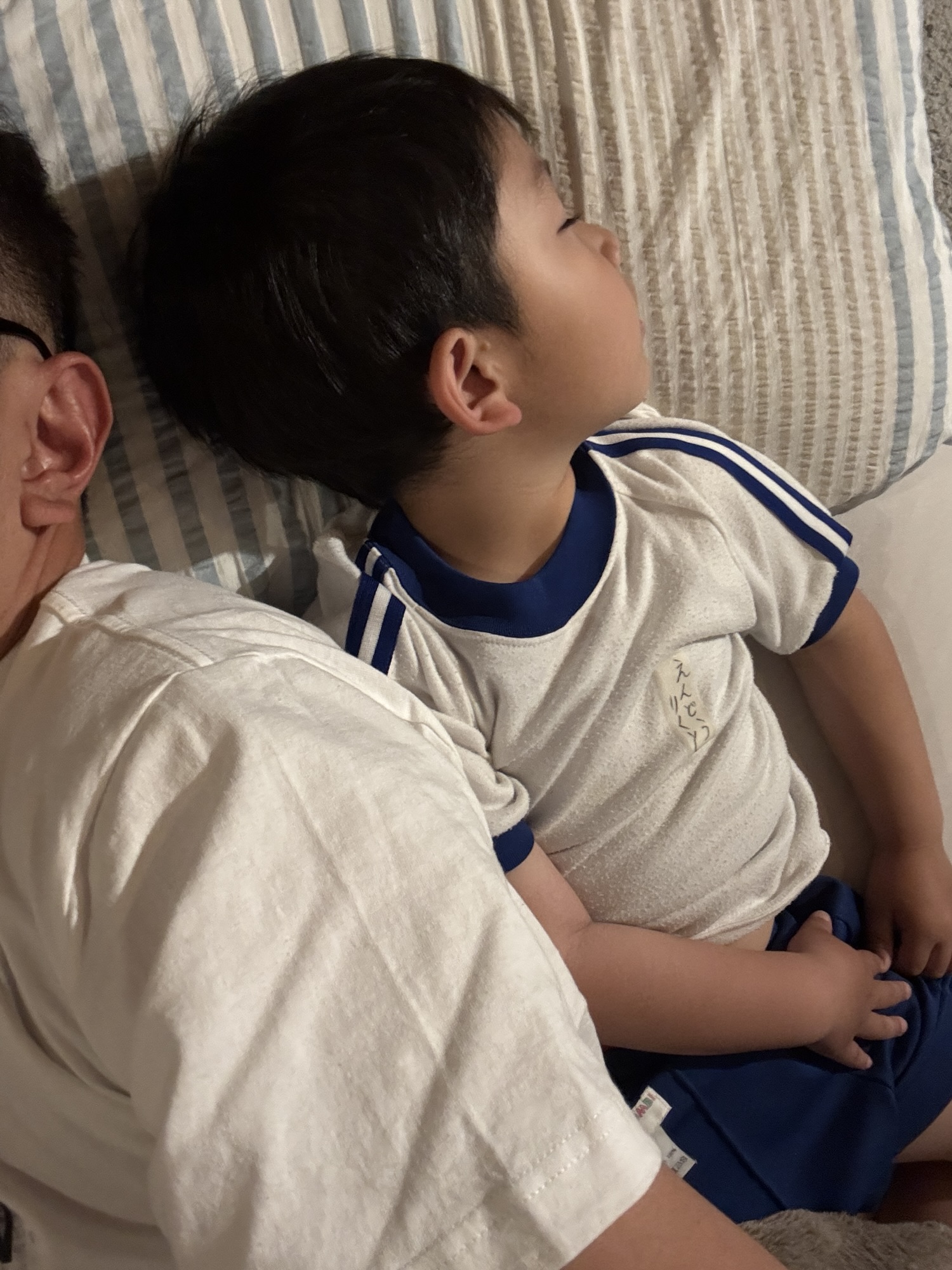16時にお迎え、色々終わらせ18時ごろ眠くてベッドでゴロゴロしてたらチビも入ってきて寝てしまいました(笑)