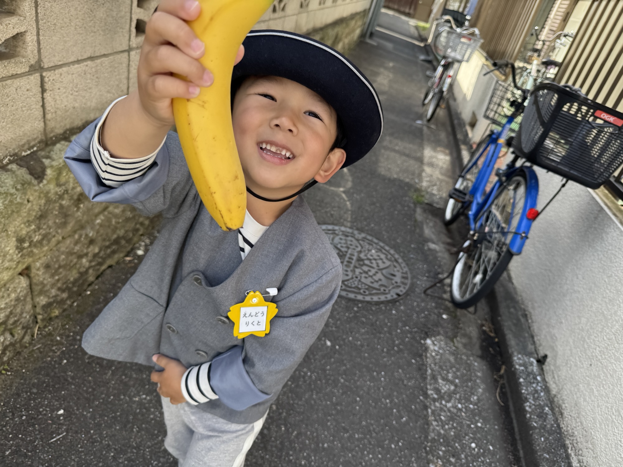 水曜は登園から。近所のおばあにお菓子とバナナをもらってご満悦な氏。